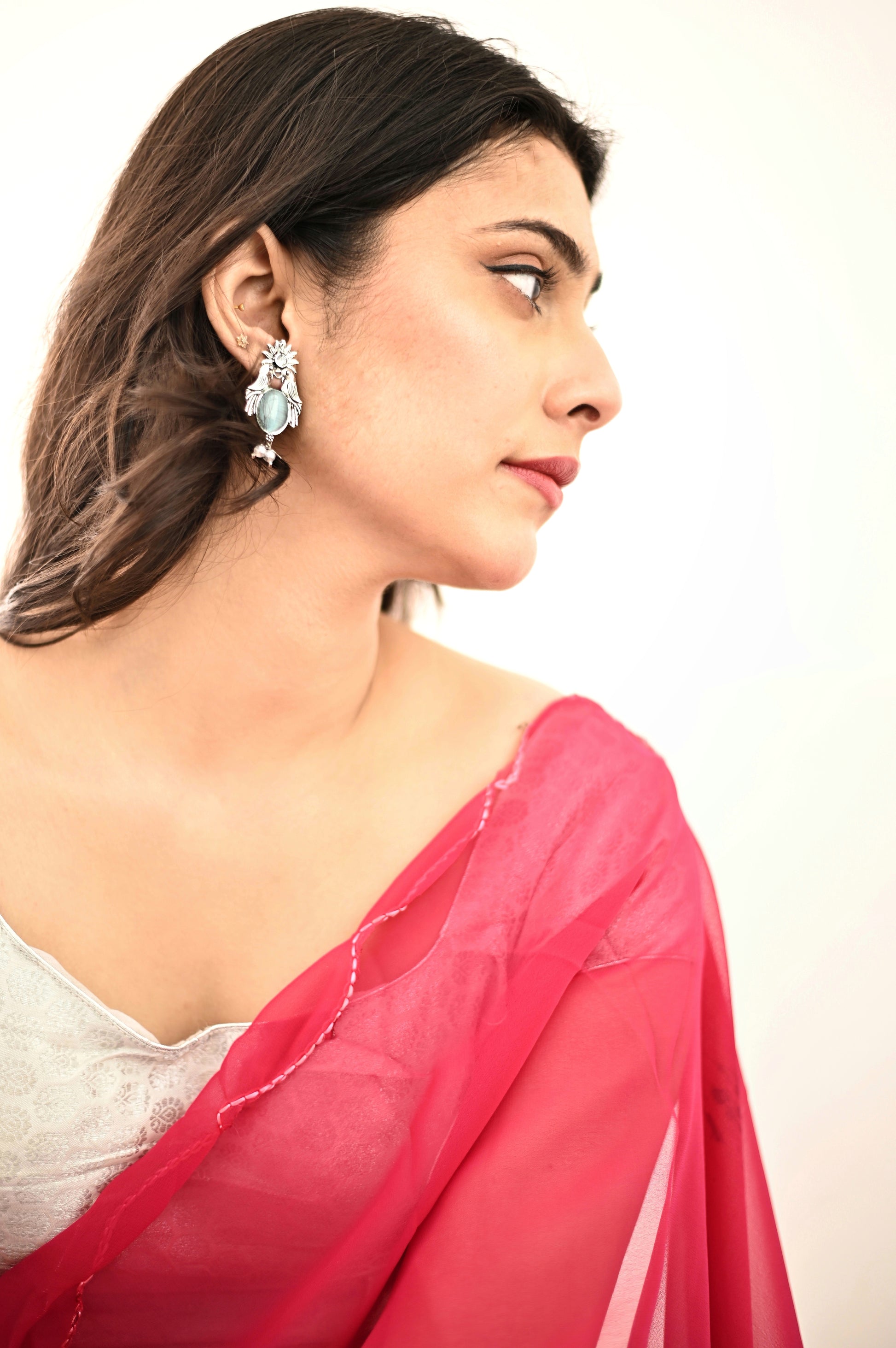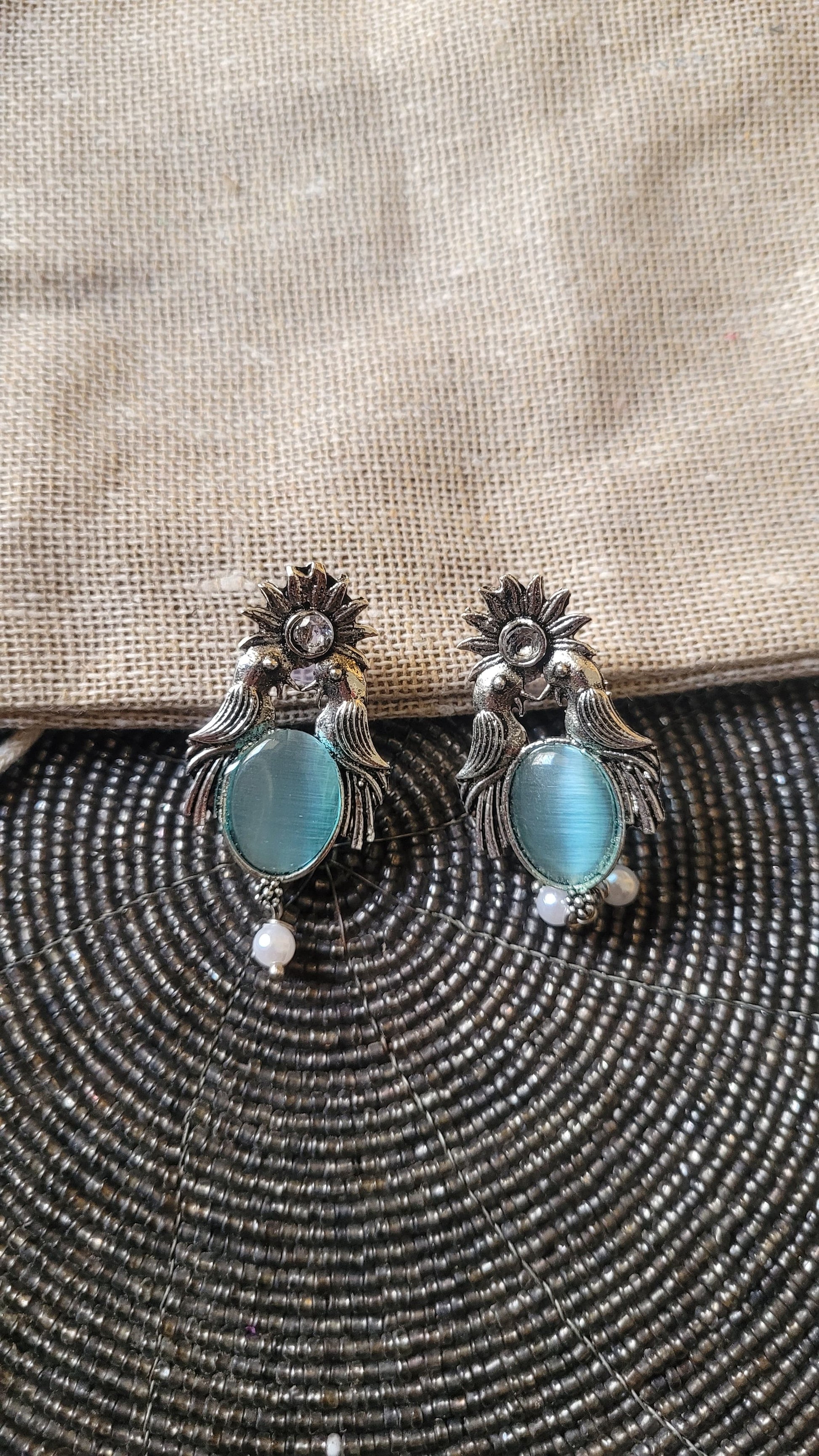 Unique and fun, these sky blue earrings feature an intricate bird and sun design, adding personality to your ethnic wear.